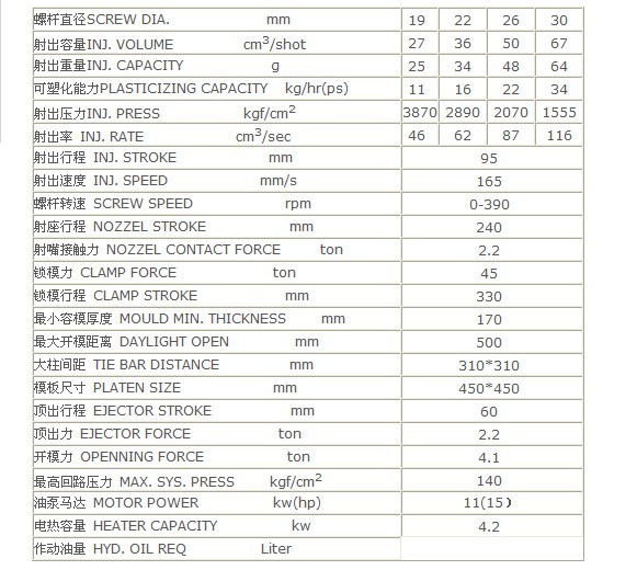 螺桿直徑:19 or 22 or 26 or 30 (mm)、射出速度:165(mm/s)、鎖模力: 45(ton)、大柱間距:310*310(mm)