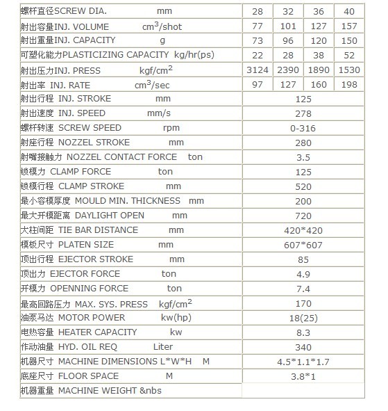 螺桿直徑:28 or 32 or 36 or 40 (mm)、射出速度:278(mm/s)、鎖模力: 125(ton)、大柱間距:420*420(mm)